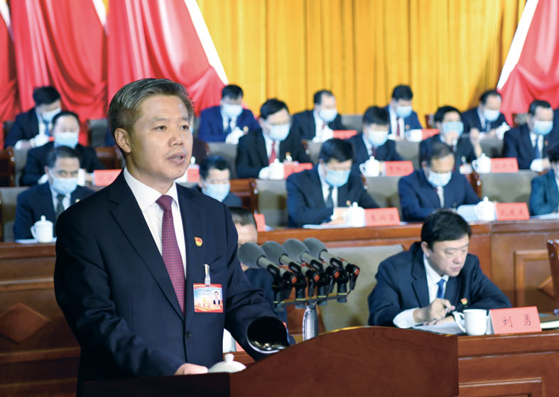 董曉宇代表中共承德市第十四屆委員會向大會作報告。本網(wǎng)記者 陳琦嘉 王立群 攝