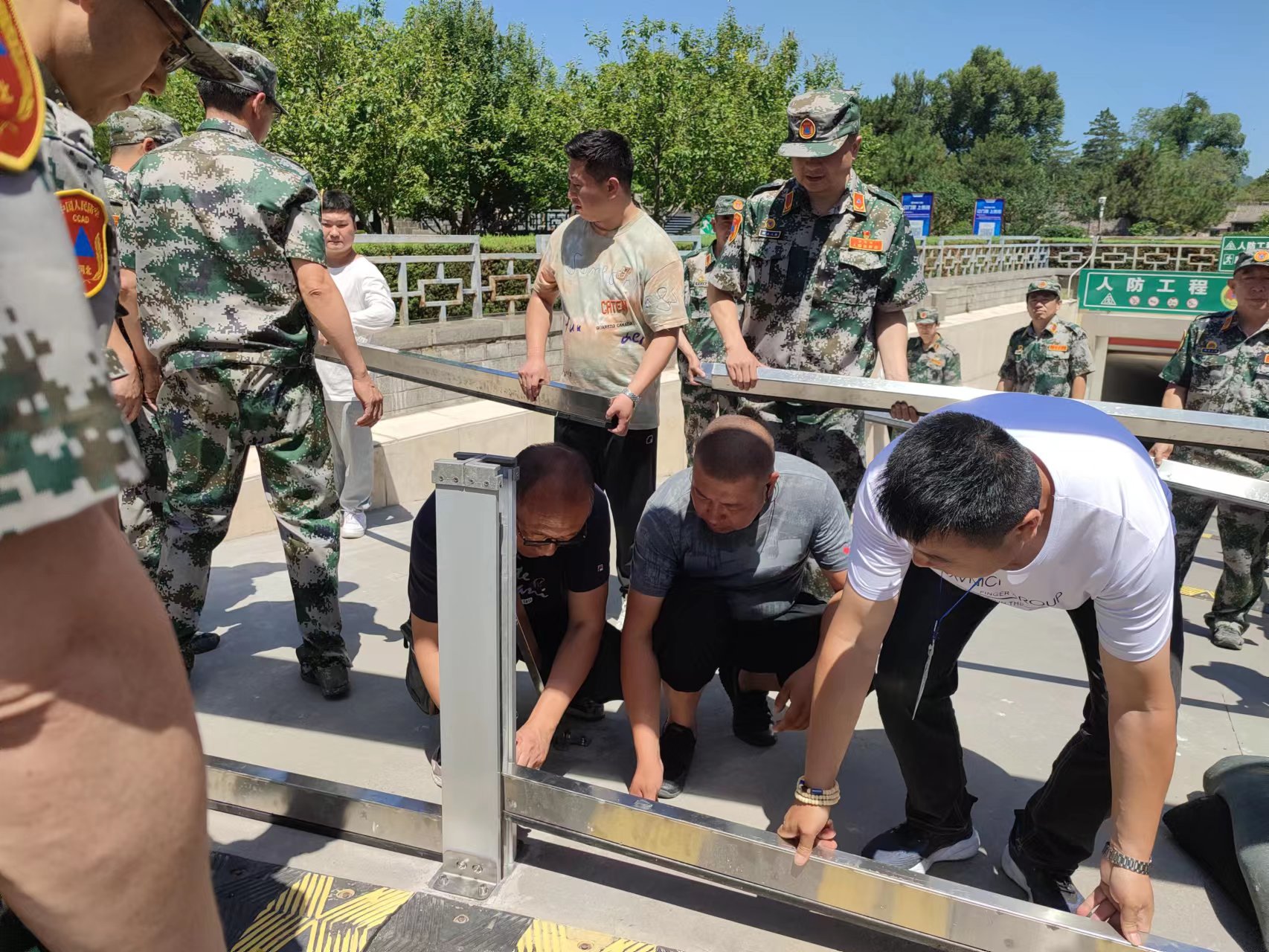 隨著現(xiàn)場指揮一聲令下,演練正式開始。停車場及人防辦工作人員把演練當做實戰(zhàn),按照演練前講解的防汛知識和注意事項,協(xié)調(diào)配合、分工明確,緊張有序地安裝擋水板,堆堵防汛沙袋。