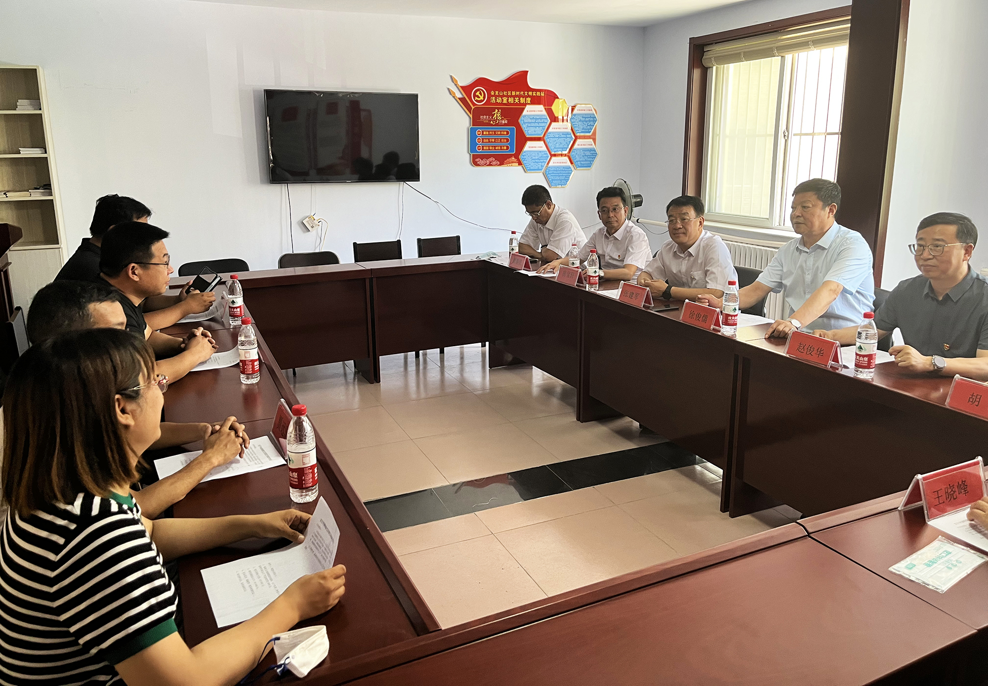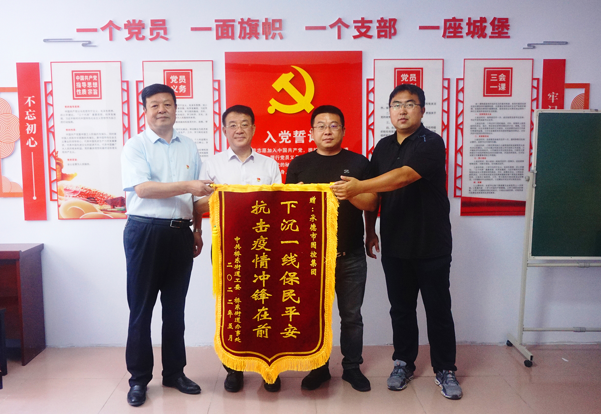 捐贈儀式后,國控集團(tuán)領(lǐng)導(dǎo)班子與橋東街道、會龍山社區(qū)主要負(fù)責(zé)人,就結(jié)對幫建工作進(jìn)行座談,詳細(xì)了解了創(chuàng)城工作開展情況、存在問題及下一步打算,針對社區(qū)基礎(chǔ)設(shè)施不完善、公共停車泊位施劃不合理、樓道雜亂和小廣告亂貼等問題,研究制定了具體舉措。會上,為感謝國控集團(tuán)在抗擊疫情和結(jié)對幫建工作中的大力支持,橋東街道、會龍山社區(qū)向集團(tuán)公司贈送了“下沉一線保民平安、抗擊疫情沖鋒在前”錦旗。