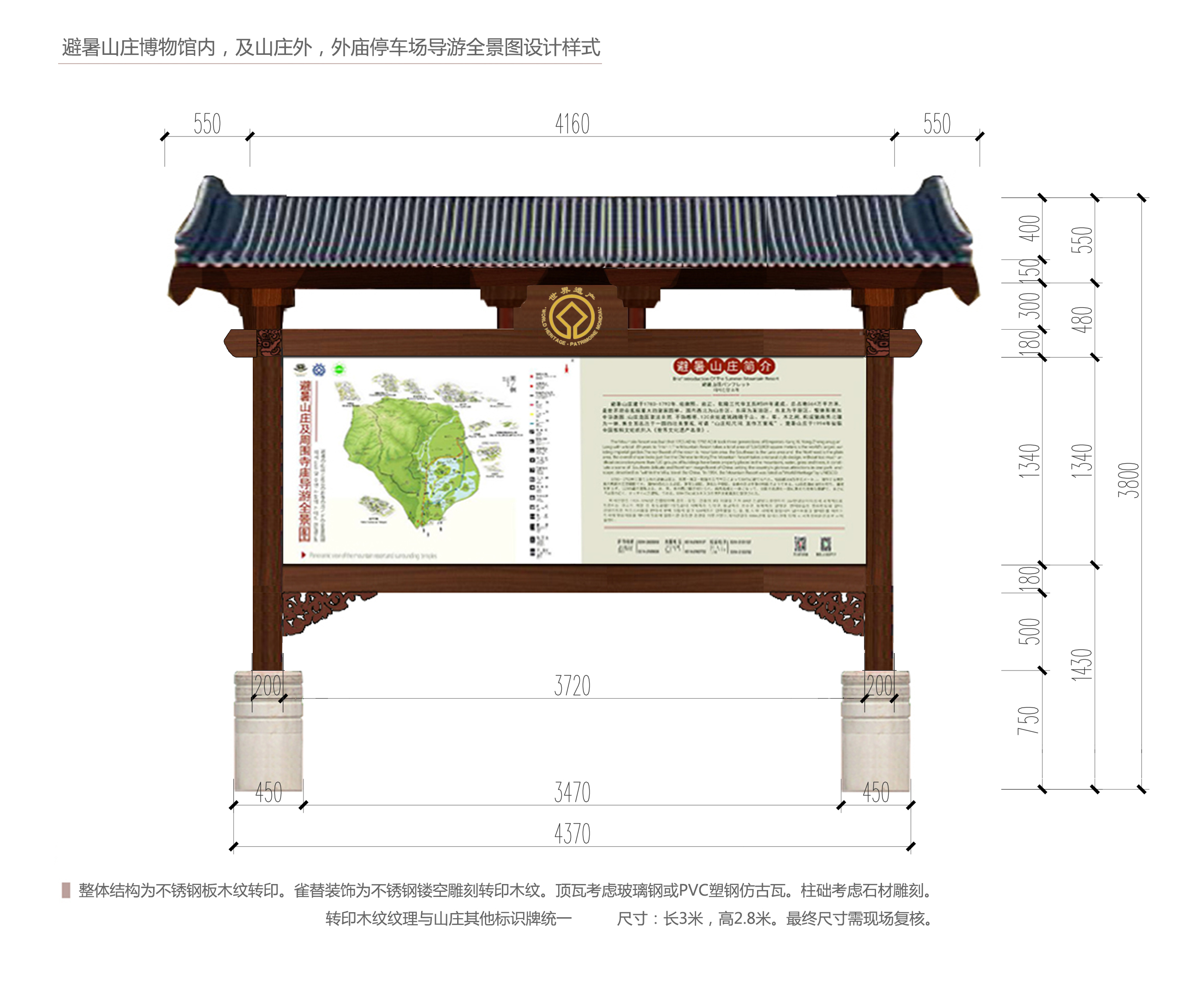 按照承德市人民政府辦公室印發(fā)的《避暑山莊及周圍寺廟景區(qū)整改提升專項工作方案》要求,在避暑山莊及周圍寺廟外5個停車場內(nèi),各設置景區(qū)導游全景圖1塊,由我公司邀請有資質(zhì)的單位進行制作和施工,現(xiàn)將有關事項通知如下: